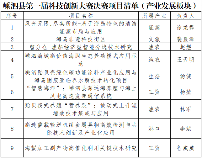 嵊泗县第一届科技创新大赛意在深入实施“创新强县”战略,激发全社会创新创业活力,加快科技成果转化,培育壮大新动能。大赛由嵊泗县科技创新中心主办,嵊泗县经济和信息化局、嵊泗县教育局、嵊泗县融媒体中心、嵊泗县科学技术协会联合协办。通过大赛,挖掘和培育一批具有创新性、成长性和市场潜力的科技创业项目,为嵊泗县因地制宜发展海洋新质生产力、走好走稳共同富裕的色之路提供支撑。