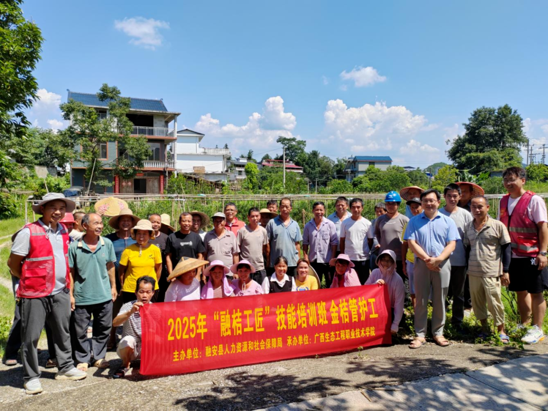 人才是产业振兴的核心引擎。融安县农技协立足融安金桔、油茶、罗汉果等特色产业发展需求,构建起“培训+竞赛+实践”三位一体的乡土人才培育体系。2025年以来,协会围绕金桔“上山”、油茶产业提质和林下经济发展,开展技术推广培训34期,覆盖1510人次,内容涵盖修剪整形、保花保果、绿色防控等关键技术;联合广西生态工程职业技术学院编写专属教学大纲与培训手册,牵头开展“粤桂协作--融安金桔管护工劳动技能培训”24期,培育1266名专业技术人才。为让人才“赛出来、用起来”,协会成功承办“融桔工匠”劳务品牌技能大赛,设置金桔整形修剪、金桔打包两大竞赛项目,吸引全县57名从业者同台竞技,通过操作效率、技术精准度、包装规范性等多维度考评,选拔出一批技术过硬、创新力强的“融桔工匠”,形成“以赛促学、以赛促练、以赛选才”的良性循环。