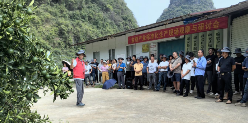 以人才赋能产业,构建闭环发展新格局。在融安县农技协的推动下,一批懂技术、善经营、能服务的乡土人才成为产业升级的“领头雁”。协会孵化的广西慧融农业服务有限公司,为金桔产业提供苗木供应、技术指导、采收销售等全链条社会化服务,实现“人才培育+产业服务”的良性互动;引导乡土人才带头参与绿色食品、富硒食品、出口基地认证,2025年已有3个基地获得绿A认证,1个基地获得出口认证,2个基地推进富硒认证,推动产业从“种得好”向“卖得好”“品牌响”转型。此外,协会借助微信公众号、抖音等新媒体平台,发布原创科普内容30期以上,通过产业技术服务微信群及时响应生产需求,让乡土人才的技术经验转化为惠及更多农户的发展红利,助力形成“苗木培育—技术服务—农产品加工—品牌销售”的闭环产业链。
