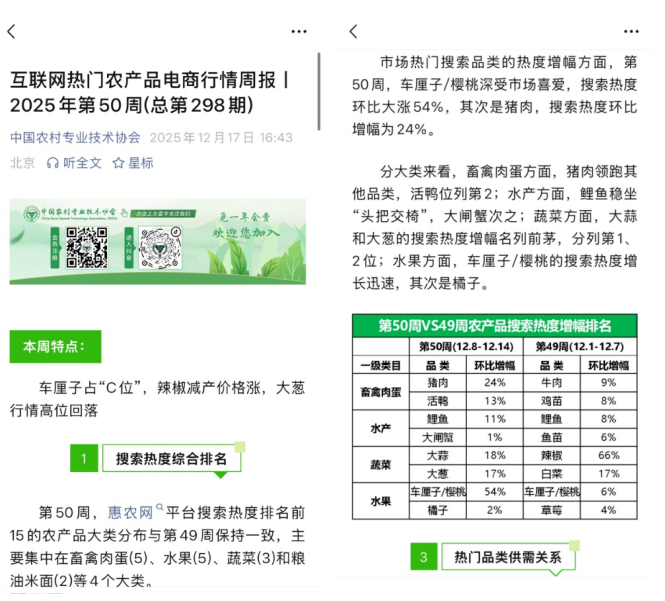 这份恒久的力量,源自一个覆盖全国2821个县级行政区的庞大感知网络,其根基正是惠农网自2016年起在行业内率先布局打造的“惠农大数据”。目前,平台累计标准化数据总量已达90.1亿条,每日稳定更新数据达356.8万条。这些鲜活的数据脉搏在此汇集,经由精深分析,转化为清晰的趋势洞察。《互联网热门农产品电商行情周报》并非普通简报,它由中国农技协信息化工作委员会、湖南省农村专业技术协会联合会与湖南惠农科技有限公司联合打造,基于惠农网平台逾5300万用户的真实交易行为与行情数据,运用创新分析模型,对搜索热门、潜力品类、供需关系、价格走势及后市预测进行多维解读。它如同为农业安装了一副“数字望远镜”,持续追踪数千类农产品的价格轨迹,洞察消费需求的潮汐变化。