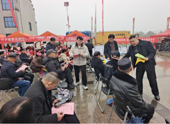 庙会广场上,舞台歌舞热闹纷呈,台下人头攒动、观众云集。农技联合会成员穿梭于人群中,热情发放着色彩斑斓的水稻、油茶、西瓜等农业栽培技术宣传单,将科技知识传递给七里八乡的来往群众。