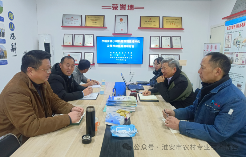 为了提升水稻育种小材料的机械化播种育秧技术水平,3月5日,淮安市农村专业技术协会组织淮安市农业科学院、淮安大学、淮安汉德农业科技有限公司的专家和技术人员,在淮安汉德农业科技有限公司会议室举办了水稻育种小材料高效精量播种机及技术应用专题研讨会。