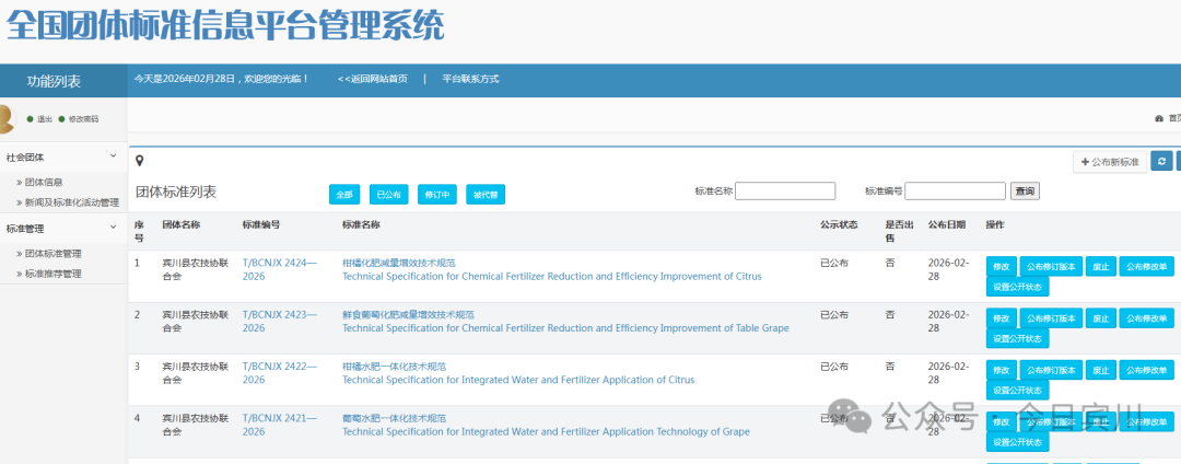 2月28日,宾川县农技协联合会在全国团体标准信息平台正式发布四项团体标准,分别为《葡萄水肥一体化技术规范》《柑橘水肥一体化技术规范》《鲜食葡萄化肥减量增效技术规范》《柑橘化肥减量增效技术规范》。四项标准聚焦宾川高原特色水果核心产业,紧扣节水节肥、绿色增效、提质增产目标,为全县葡萄、柑桔标准化生产与绿色转型提供统一技术遵循,标志着宾川水果产业标准化、规范化、绿色化发展再上新台阶。本次发布的四项团体标准,由宾川县农技协联合会牵头,联合县农业农村局、县农业绿色发展服务中心、县科协、乡镇农业综合服务机构、云南省农业科学院相关研究所、本地龙头企业与科技小院等产学研单位共同编制。标准编制团队深入田间地头调研,充分吸纳干热河谷区种植实践经验,广泛征求种植户、合作社、企业及专家意见,严格按照立项、起草、评审、公示、发布等流程推进,确保科学性、实用性与可操作性,贴合宾川产业实际与农户生产需求。四项标准形成水肥精准管控+化肥减量增效双轮驱动技术体系,水肥一体化技术规范明确葡萄、柑桔水源、设备、系统配置、水肥耦合、使用维护及生产档案管理要求,推广滴灌、精准施肥、少量多次模式,实现节水、节肥、省工、提质;化肥减量增效技术规范聚焦有机肥替代、精准定量施肥、水肥一体化集成、中微量元素补充与绿色投入品使用,明确肥料种类、施用浓度、时期与方法,推动化肥用量负增长、果品品质大提升。这四项团体标准发布实施,将有效解决分散种植中用水粗放、施肥盲目、管理不统一等痛点,助力农户降低生产成本、提升果实商品率与安全性,推动产业从“经验种植”向“标准种植”转型,助力宾川建设“世界一流水果之乡”。