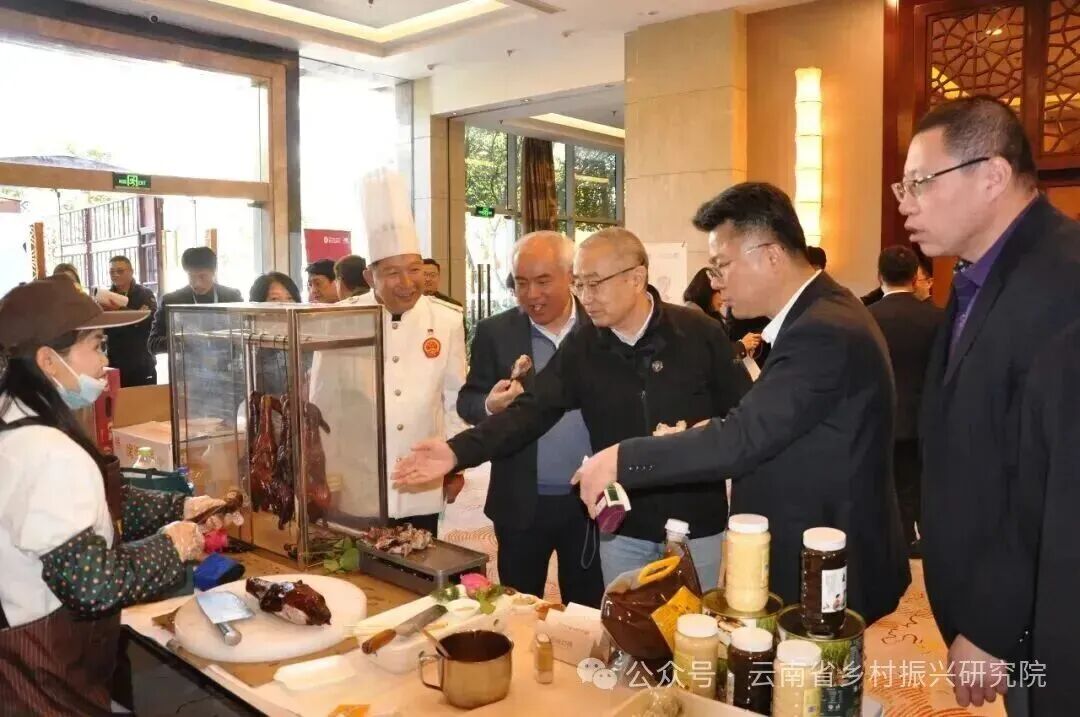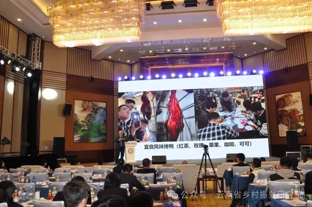 按照工作安排,宜良山鸭科技小院带着“宝洪茶烤鸭”等4个试验成功的烤鸭创新产品参加展示。活动现场,宜良山鸭科技小院项目负责人,中国注册烹饪大师,非物质文化遗产代表性项目昆明焖炉烤鸭制作技艺、市级代表性传承人,宜良山鸭养殖有限公司董事长黎艳辉先生展示了宜良烤鸭传统技艺,科学家和企业家代表都品尝了“飘香万里宜良宝洪茶烤鸭”“回望故乡云南咖啡味宜良烤鸭”“云上味道玫瑰花宜良烤鸭”“多味云南草果香宜良烤鸭”。鲜香酥脆嫩甜的宜良烤鸭充满了科技味,得到了参会科学家、企业代表的一致好评。