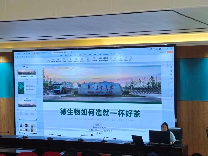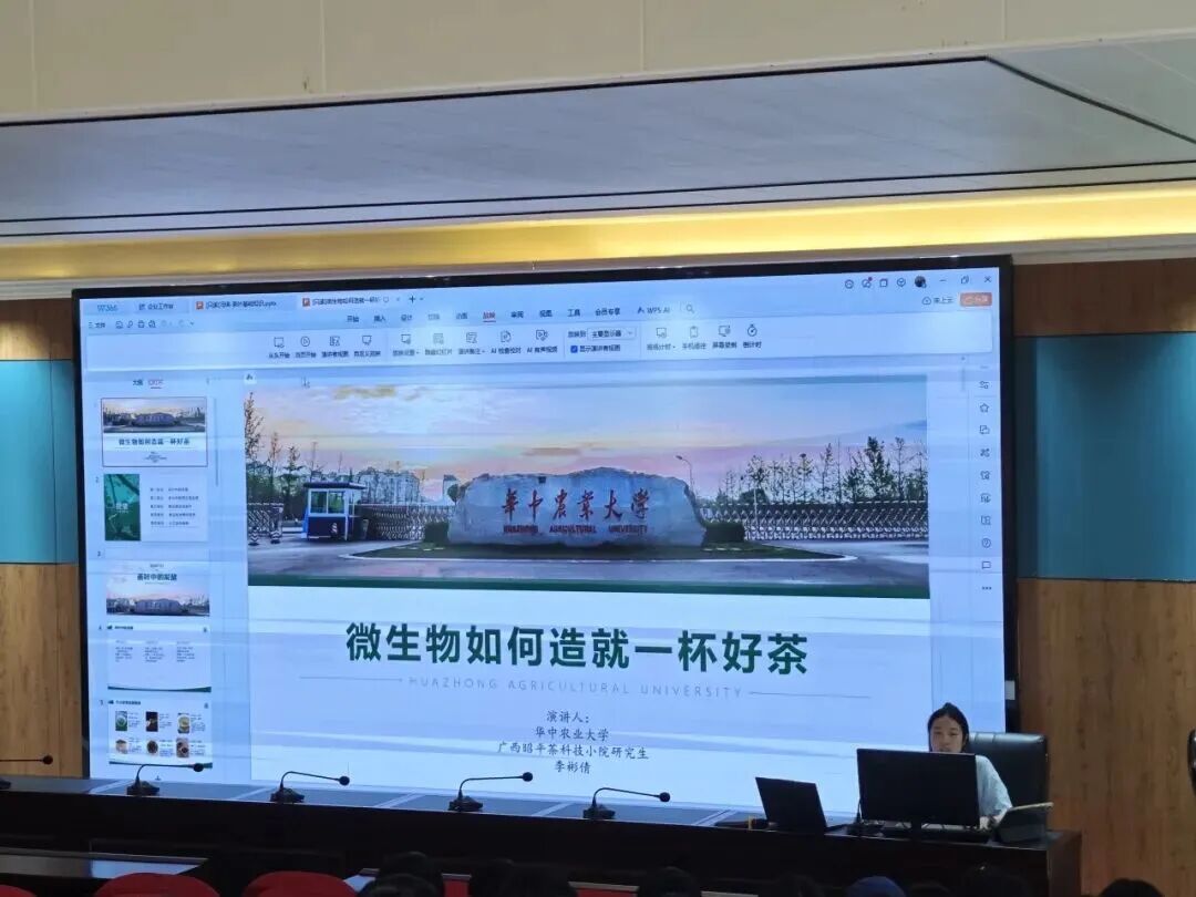 研究生李彬倩带来《微生物如何造就一杯好茶》专题分享,将专业科研知识转化为通俗易懂的科普内容,深入浅出地讲解微生物在茶叶发酵过程中的作用机理,并结合华中农业大学课题组在微生物定向发酵领域的研究成果,揭秘风味形成机理与科技赋能路径,让在场师生直观感受“一杯好茶里的科技力量”。