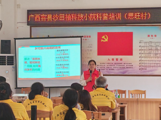 4月是沙田柚春季管护的关键时期。为抢抓春管黄金期,提升果农种植技术水平,推动沙田柚产业绿色高质量发展,近期,广西大学农牧产业发展研究院正高级农艺师、广西容县沙田柚科技小院首席专家范稚莲带领小院研究生,先后走进广西容县浪水村、思旺村,围绕沙田柚春季管护开展土壤改良与水肥管理专项技术培训,以科技力量护航柚果品质提升。