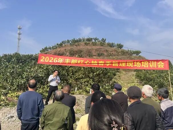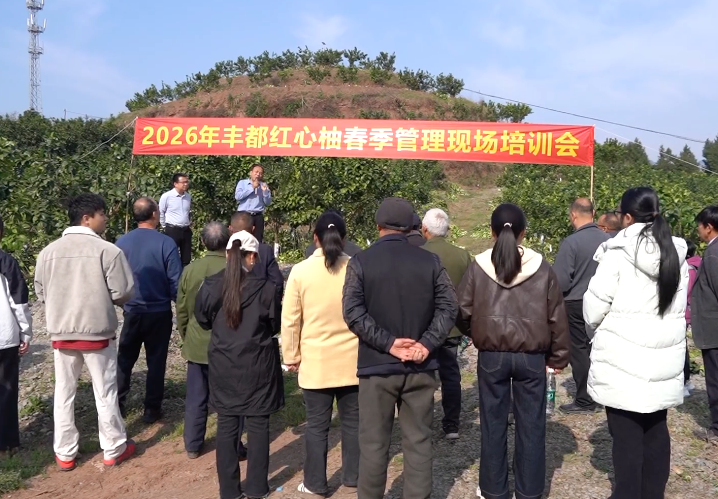 春回大地,柚园管护进入关键期。2026年3月13日,由丰都县科学技术协会、丰都红心柚协会及西南大学柑桔研究所共同举办的丰都红心柚春季栽培管理技术现场培训会在丰都县三元镇顺利举行。西南大学柑桔研究所栽培与生理研究中心主任、科技小院首席专家淳长品带领小院研究生张佳玲、董志伟现场授课,三元镇50余名红心柚种植大户及相关工作人员参与培训。培训会由丰都红心柚协会会长李世成主持。