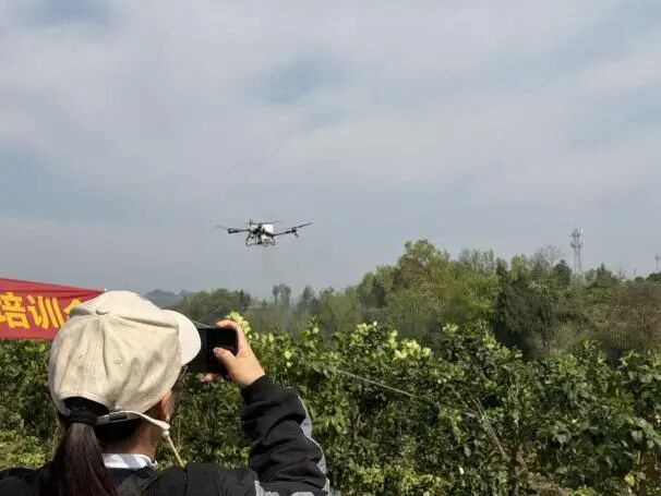 实操环节,淳长品老师手把手演示修枝技巧,讲解如何通过科学剪枝改善通风透光,张佳玲、董志伟在旁协助指导。此外,专业无人机飞手现场演示果园打药,介绍无人机高效、精准的优势及操作规范,让果农感受到现代农业科技的便利。
