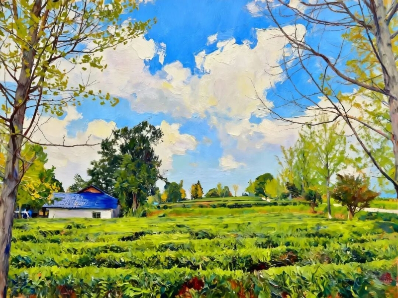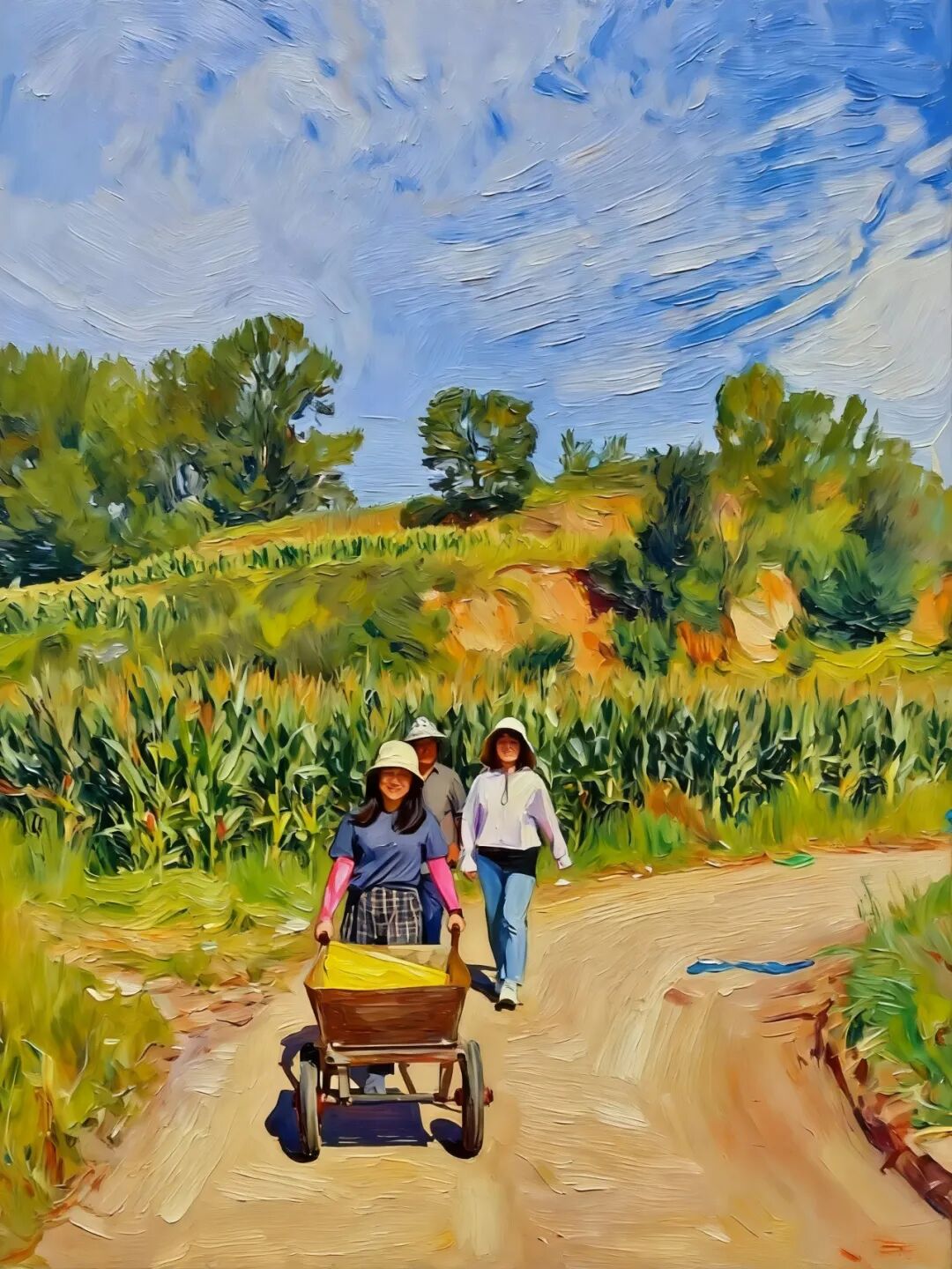 从金井茶厂飘香的茶园,到凤凰猕猴桃硕果累累的枝头,父女俩的镜头像是一支画笔。透过AI数智摄影与油画艺术的融合,真实的场景被赋予了油画的质感——那是大地最厚重的底色,也是青春最热烈的色彩。
