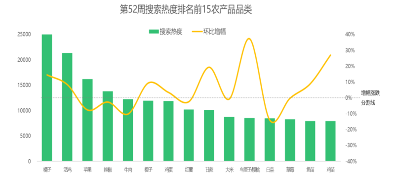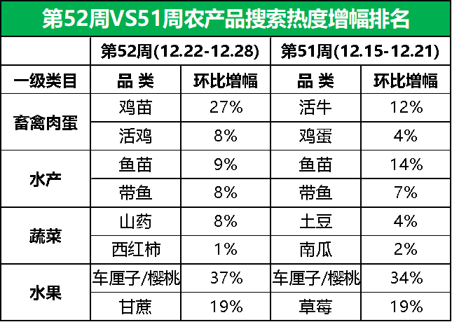 市场热门搜索品类的热度增幅方面,第52周,车厘子/樱桃继续领涨,搜索热度环比上涨37%,其次是鸡苗,搜索热度较上周上涨27%。