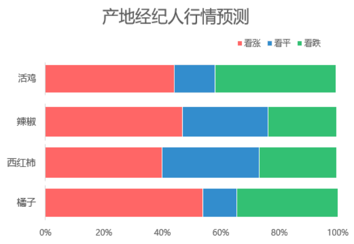 据产地经纪人对热门品类后市行情预测:活鸡和橘子看涨和看跌各占一定的比重,但看涨的比重稍多一些;辣椒和西红柿后市行情大概率稳中有涨,看涨和看稳的合计比重均超过70.0%。
