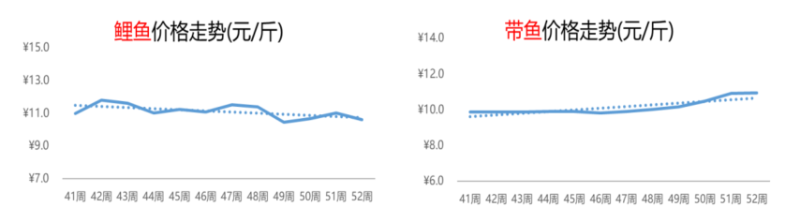 从周均价走势来看,带鱼价格在上涨至高点后开始逐步趋稳。第52周,带鱼的价格维持在10.9元/斤,环比基本持平,同比上涨17%。