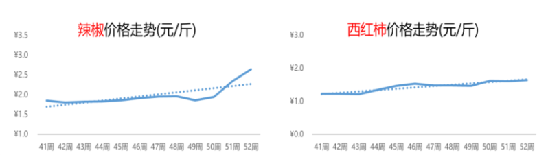 第52周,西红柿的价格为1.6元/斤,与上周相比上涨2%,与去年同期相比上涨36%。此轮价格上涨主要是11月产区冻害与12月北方降雪相继影响了采收,导致西红柿市场供应量下降,价格上涨。