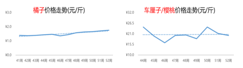 随着海运车厘子大量到货,价格继续下跌,但环比跌幅有所收窄。第52周,车厘子/樱桃的价格为20.2元/斤,较上周和去年同期分别下跌5%和58%。