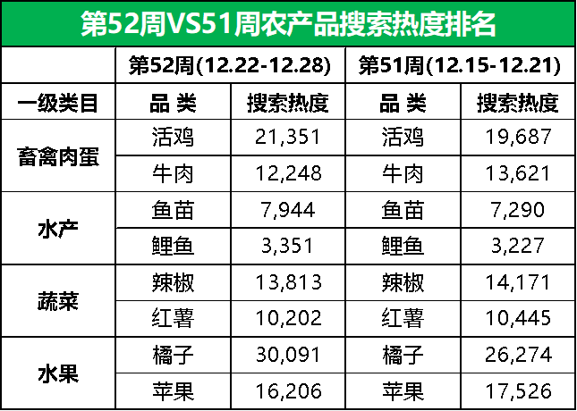 据惠农网平台对畜禽肉蛋、水产、蔬菜和水果4大农产品类目的重点监测与追踪,第52周,畜禽肉蛋、水产、蔬菜和水果排名前2位的品类与上周相重叠,但搜索热度均有所调整:畜禽肉蛋方面,活鸡热度持续升温,牛肉热度出现下滑;水产排名前2位的品类热度全线飘红;蔬菜排名前2位的品类热度同步走低;水果方面,橘子较前一周更受追捧,而苹果热度有所回调。