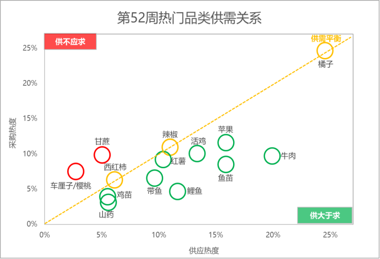 分析惠农网平台热门品类的供需关系:甘蔗和车厘子/樱桃的供应相对偏紧;橘子、辣椒和西红柿的供需相对均衡;山药、鸡苗、带鱼和红薯等9个品类的供应相对充足。