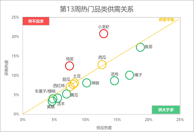 分析惠农网平台热门品类的供需关系:小龙虾和鸡苗的供应相对偏紧;西红柿、甜瓜、土豆和西瓜的供需相对均衡;黄鳝、车厘子/樱桃、黄瓜和辣椒等8个品类的供应相对充足。