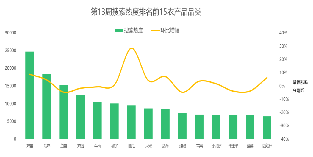从环比增幅来看,第13周排名前15的农产品品类的市场关注度多数上涨。鸡苗、活鸡、橘子、西瓜和大米等9个品类的搜索热度实现增长,鱼苗、鸡蛋、牛肉、辣椒和干玉米等6个品类的搜索热度有所下滑。具体细分到品类,西瓜的市场关注度持续升温,本周环比再涨28%,稳居冠军位;辣椒和鱼苗的市场关注度跌幅较为靠前,环比均下跌5%。