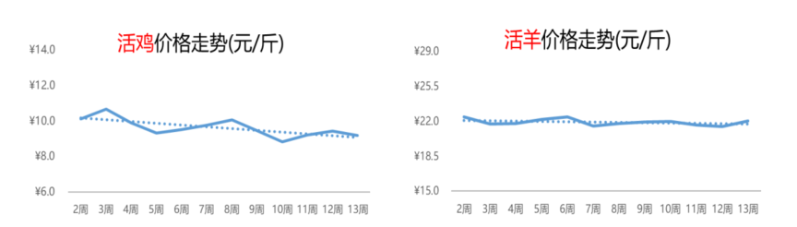 与活鸡的行情相反,活羊的价格在连跌2周后迎来上涨行情。第13周,活羊的价格为22.1元/斤,环比和同比分别上涨3%和5%。