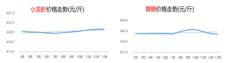 近期,小龙虾的上市量较前期有所增加,价格结束连涨态势,进入平稳运行阶段。第13周,小龙虾的价格为21.2元/斤,环比基本持平,同比下跌17%。