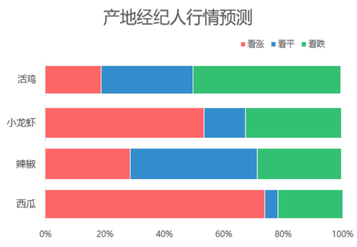 据产地经纪人对热门品类后市行情预测:活鸡后市价格或将稳中伴跌,看稳和看跌的合计比重高达81.3%;小龙虾看涨和看跌各占一定的比重,但看涨的比重要多一些;辣椒看稳的比重为42.9%,高于看涨和看跌;西瓜方面,其后市行情上涨的可能性大,看涨的比重超过7成。