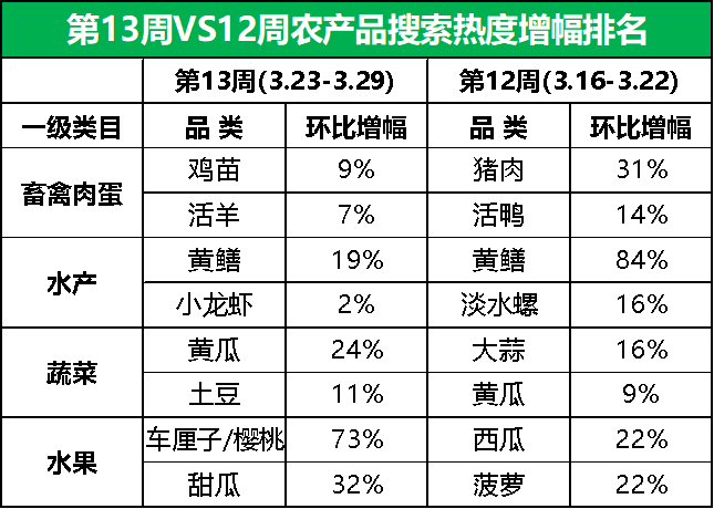 市场热门搜索品类的热度增幅方面,第13周,车厘子/樱桃成市场“主角”,搜索热度较上周大涨73%,其次是甜瓜,搜索热度环比增幅为32%。