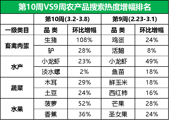 市场热门搜索品类的热度增幅方面,第10周,生猪成增长“黑马”,搜索热度较上周飙升108%,其次是菠萝,搜索热度环比增幅为52%。