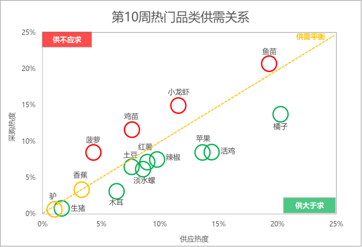 分析惠农网平台热门品类的供需关系:鱼苗、鸡苗、小龙虾和菠萝的供应相对偏紧;驴和香蕉的供需相较平衡;橘子、苹果、辣椒、红薯和土豆等9个品类的供应相对充足。