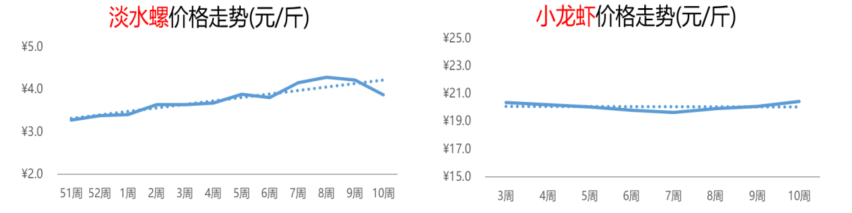 当前,小龙虾供应量相对有限,市场行情逐周稳步上扬。第10周,小龙虾的价格为20.4元/斤,环比上涨2%,同比却下跌19%。