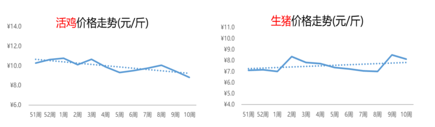 近期,活鸡价格在市场供需博弈下波动频繁,行情整体趋势向下。第10周,活鸡的周均价为8.8元/斤,较第10周和第51周分别下跌7%和14%,但较去年第10周上涨7%。