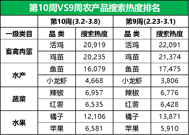 据惠农网平台对畜禽肉蛋、水产、蔬菜和水果4大农产品类目的重点监测与追踪,第10周,畜禽肉蛋、水产、蔬菜和水果排名前2位的品类与上周相重叠,但热度均有所调整:畜禽肉蛋排名前2位的品类热度双双回落;水产方面,鱼苗热度出现下滑,而小龙虾热度升温;蔬菜排名前2位的品类热度同步攀升;水果方面,橘子热度走低,苹果热度则有所上涨。