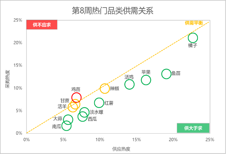分析惠农网平台热门品类的供需关系:鸡苗的供应相对偏紧;辣椒、活羊和甘蔗的供需相较平衡;大蒜、南瓜、淡水螺、红薯和活鸡等9个品类的供应相对充足。