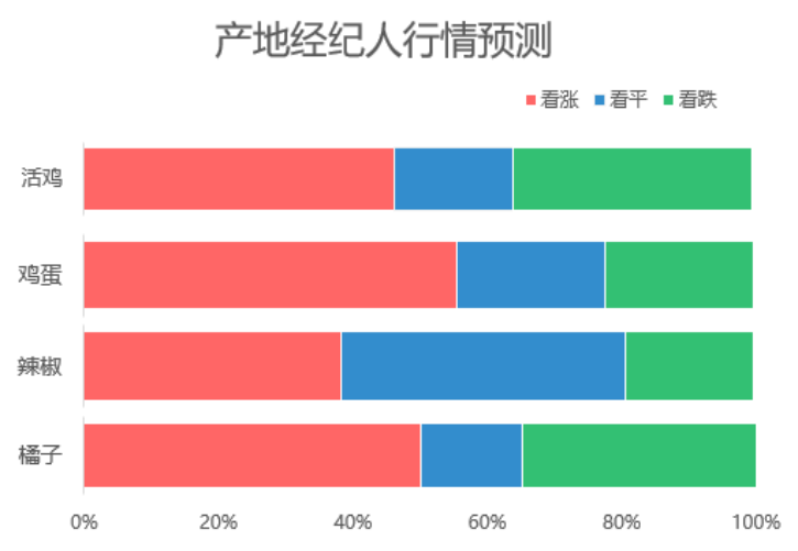 据产地经纪人对热门品类后市行情预测:活鸡、鸡蛋和橘子看涨、看稳和看跌各占一定的比重,但看涨的比重略多一些;辣椒后市看稳的比重占42.3%,稍高于看涨。