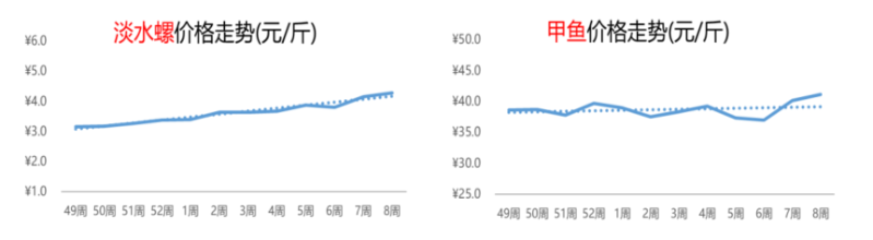 惠农大数据显示,甲鱼市场表现亮眼,行情已经突破41元/斤。第8周,甲鱼的价格为41.1元/斤,与上周相比上涨2%;与去年同期相比,上涨3%。