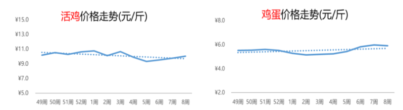 春节期间,市场对鸡蛋的采购需求减少,蛋价呈现回落态势。第8周,鸡蛋的价格为5.9元/斤,环比和同比双双下滑,跌幅分别为1%和13%。