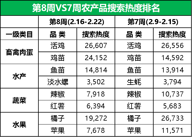 从环比增幅来看,第8周排名前15的农产品品类的市场关注度涨跌基本持平。鸡苗、活羊、鱼苗、甘蔗和干玉米等7个品类的搜索热度实现增长,橘子、牛肉、鸡蛋、大米和辣椒等7个品类的搜索热度有所下滑,活鸡的搜索热度与上周基本持平。具体细分到品类,鸡苗突飞猛进,市场关注度环比大涨66%;苹果的市场关注度回落较快,环比跌幅为34%。