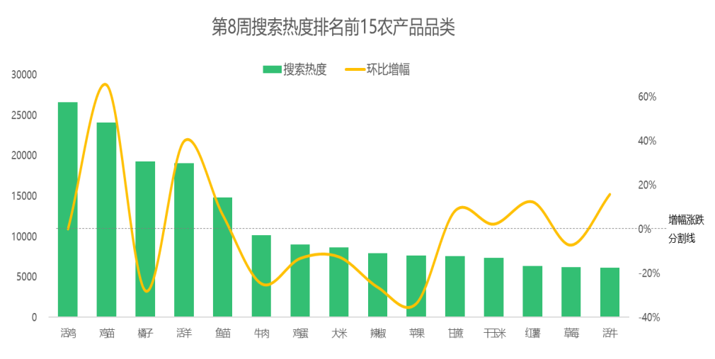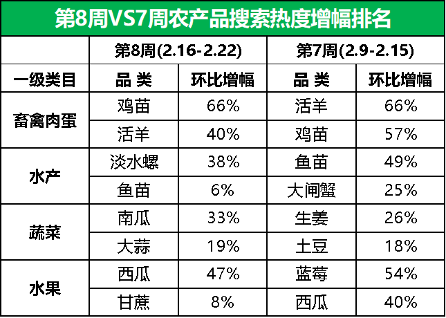 市场热门搜索品类的热度增幅方面,第8周,鸡苗的搜索热度快速攀涨,以66%的环比增幅居首,西瓜和活羊依次随后,搜索热度较上周分别上涨47%和40%。