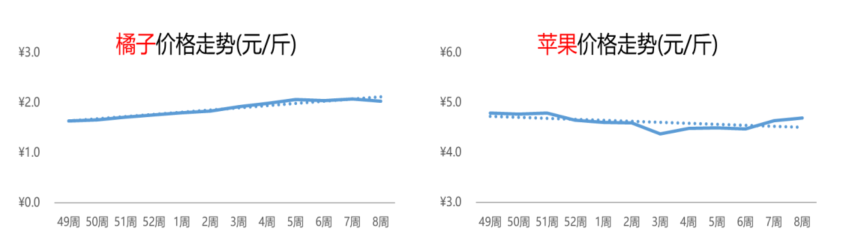 橘子的价格虽然出现轻微的下滑,但整体上行趋势未改。第8周,橘子的周均价为2.0元/斤,较上周下跌2%,较第49周上涨24%;而与去年第8周相比,下跌5%。