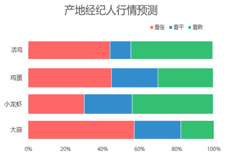 据产地经纪人对热门品类后市行情预测:活鸡看涨和看跌的比重均为44.4%,后市行情如何暂不明朗;鸡蛋和大蒜看涨、看稳和看跌各占一定的比重,但看涨的比重要多一些;小龙虾后市价格大概率仍会下跌,看跌的比重为43.9%,稍高于看涨和看稳。