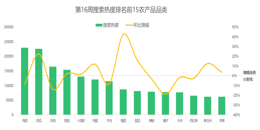 从环比增幅来看,第16周排名前15的农产品品类的市场关注度涨跌基本持平。西瓜、鱼苗、小龙虾、鸡蛋和榴莲等8个品类的搜索热度实现增长,鸡苗、活鸡、牛肉、辣椒和橘子等7个品类的搜索热度有所下滑。具体细分到品类,榴莲涨势尤为强劲,市场关注度较上周大涨43%;而橘子的市场关注度下滑较快,环比跌幅为19%。