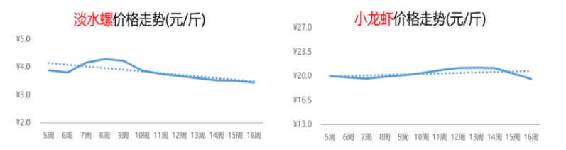 受气温升高的影响,小龙虾的生长速度加快,上市量稳步攀升,价格延续下行。第16周,小龙虾的价格为19.6元/斤,环比和同比均出现下滑,跌幅分别为4%和14%。
