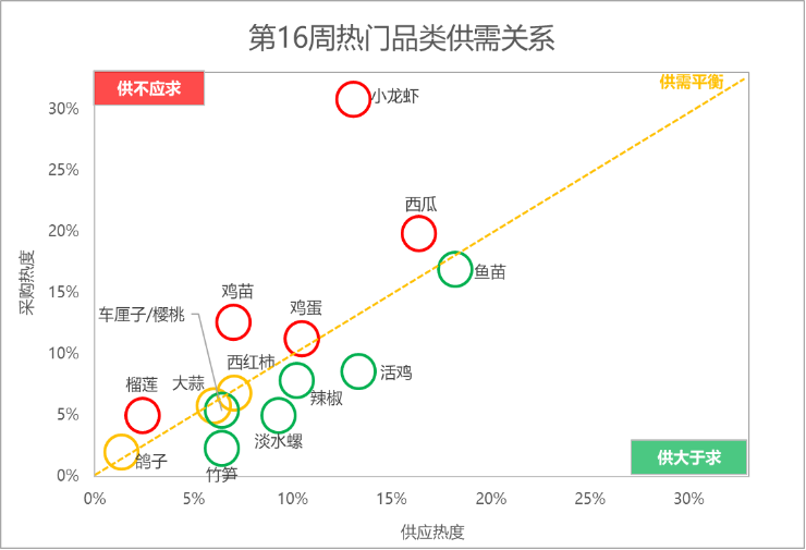 分析惠农网平台热门品类的供需关系:西瓜、鸡蛋、鸡苗、小龙虾和榴莲的供应相对偏紧;西红柿、大蒜和鸽子的供需相对稳定;辣椒、活鸡、竹笋和鱼苗等6个品类的供应相对充足。
