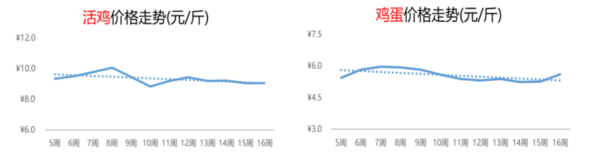 不难看出,近几个月活鸡的行情整体呈现“先明显波动,后窄幅调整”的走势。第16周,活鸡的价格为9.1元/斤,环比基本持平,同比上涨2%。